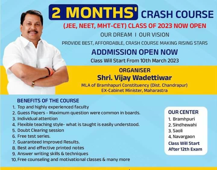 ध्येय गाठण्याची जिद्द असलेल्या विद्यार्थ्यांसाठी माजी मंत्री, आमदार विजय वडेट्टीवार यांच्या पुढाकारातून मोफत क्रॅश कोर्स उपलब्ध करून देण्याचे नियोजन करण्यात आले आहे.