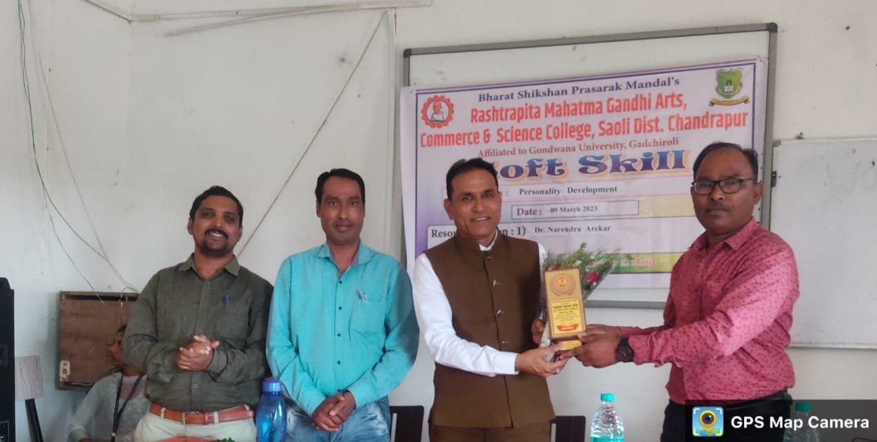 राष्ट्रपिता महात्मा गांधी कला वाणिज्य व विज्ञान महाविद्यालय सावली येथील कौशल्य विकास समितीच्या वतीने महाविद्यालयीन विद्यार्थ्यांसाठी व्यक्तिमत्त्व विकास या विषयावर मार्गदर्शन कार्यक्रम घेण्यात आला. या कार्यक्रमाचे अध्यक्षस्थानी महाविद्यालयाचे वरीष्ठ प्राध्यापक डॉ. दिवाकर उराडे (समाजशास्ञ प्रमुख) होते त्यांनी आपल्या भाषणातून विद्यार्थ्यांना व्यक्तिमत्त्व विकासाकरिता नेतृत्व कौशल्य विकसित करा असे मत व्यक्त केले. कार्यक्रमाचे मुख्य मार्गदर्शक डॉ नरेंद्र तुकडोजी आरेकर यांनी विद्यार्थांना नोकरी किंवा व्यवसाय मध्ये यशस्वी करायचं असेल तर शिक्षणाबरोबरच व्यक्तिमत्त्व विकास करणे अत्यावश्क आहे.यामध्ये प्रामुख्याने संवाद साधण्याची कला, संघभावनेने काम करण्याची कला,समस्या सोडवण्याची कला,लोक कौशल्य इत्यादी विविध गुणकौशल्य आपल्या व्यक्तीम्त्वाबाबत असणे आवश्यक आहे.तसेच त्यांनी म्हंटले की जर तुम्ही आपल्या जीवनात आत्मविश्वास,इच्छाशक्ती,सकारात्मक दृष्टीकोन,क्रियाशीलता, महत्वाकांक्षा (आईस्क्रीम) या मंत्राचा वापर केले तर नक्की तुम्ही जीवनात यशस्वी होणार असे सखोल मार्गदर्शन केले. कार्यक्रमाच् प्रास्ताविक प्रा. स्मिता राऊत (कौशल्य विकास समिती) यांनी केले .तसेच या कार्यक्रमाचे संचालन कुमारी तनवी मुनघाटे तर आभार रुपाली साखरे हिने मानले. कार्यक्रमाचे आयोजन कार्यकारी प्राचार्य डॉ. अशोक खोब्रागडे यांच्या मार्गदर्शनाखाली करण्यात आले.कार्यक्रमाच्या यशस्वीतेसाठी प्रा. राम वासेकर ,प्रा. संदीप देशमुख , प्रा.दिलीप सोनटक्के , प्रा.देवीलाल वाताखेरे, डॉ .किरण बोरकर, प्रा.विनोद बडवाईक,डॉ प्रफुल वैराळे, प्रा.संघानंद बागडे, डॉ.विजयसिंग पवार ,प्रा.प्रकाश घागरगुंडे , प्रा.मुकेश निखाडे,प्रा.आशिष शेंडे, डॉ. राजश्री मार्कंडेवार ,डॉ. रागिनी पाटील इत्यादी मंडळी व विद्यार्थी, शिक्षकेत्तर कर्मचारी हरिभाऊ चचाने,किशोर बोरकर, सातक भाऊ यांचे सहकार्य लाभले.