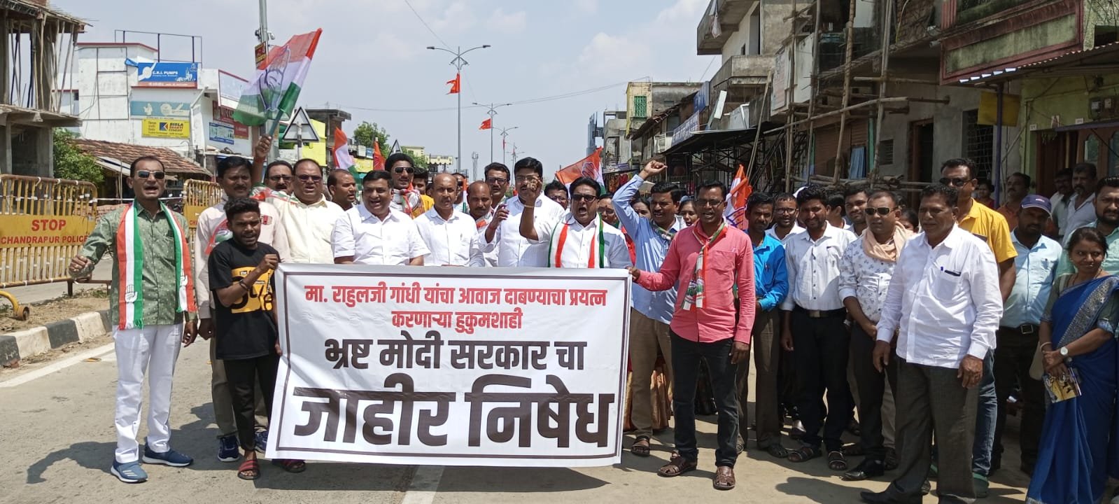 केंद्रातील मोदी सरकारकडून मनमानी, हुकूमशाही राज्यकारभार चालू असून लोकशाहीचा गळा घोटला जात आहे.अनेक जनविरोधी निर्णय घेतले जात आहेत.काँग्रेसचे नेते खासदार राहुलजी गांधी यांनी मोदी सरकारचा खरा हुकुमशाहीवृत्तीचा भ्रष्ट चेहरा जनतेसमोर आणला.त्यामुळे केंद्र सरकारकडून सुडबुद्धीने अनेक ठिकाणी खटले दाखल करून त्यांना अडकविण्याचा प्रयत्न केला जात आहे.त्यामुळे केंद्रातील मोदी सरकारविरोधात मा.संदीप पा. गड्डमवार, माजी जि.प.उपाध्यक्ष आणी मा.दिनेश पा. चिटणुरवार माजी बांधकाम सभापती जि.प.चंद्रपूर यांच्या नेतृत्वात आज मा.आमदार श्री.विजयभाऊ वडेट्टीवार जनसंपर्क तथा काँग्रेस पक्ष कार्यालय ते बस स्थानक चौका पर्यंत निषेध आंदोलन करण्यात आले.