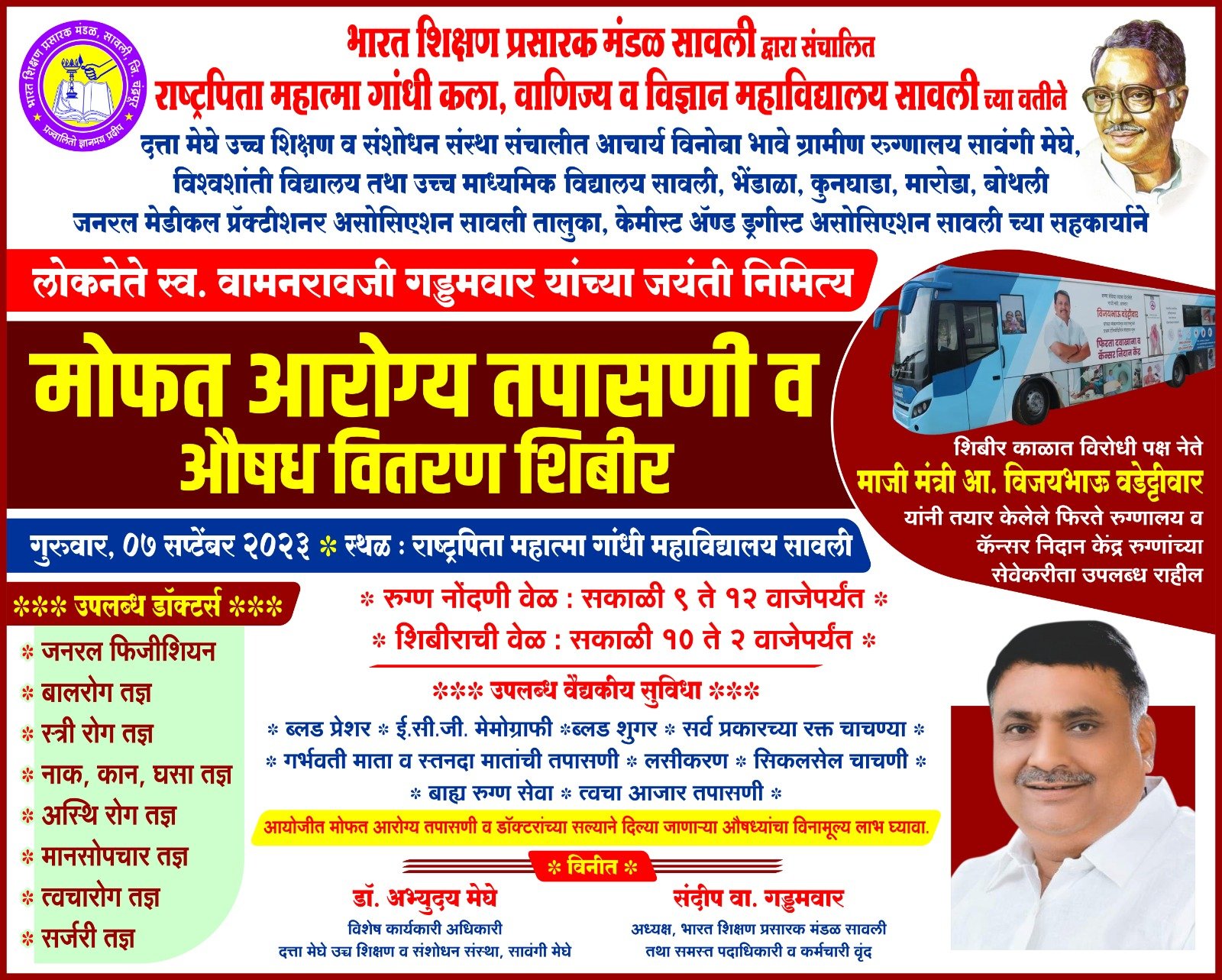 सावली: सावली तालुक्याचे शिल्पकार, माजी राज्यमंत्री तथा भारत शिक्षण प्रसारक मंडळ सावलीचे संस्थापक अध्यक्ष लोकनेेते स्व. वामनरावजी गड्डमवार यांच्या जयंतीचे औचित्य साधून भारत शिक्षण प्रसारक मंडळ सावली आणि राष्ट्रपिता महात्मा गांधी कला वाणिज्य व विज्ञान महाविद्यालय सावलीच्या वतीने दत्ता मेघे उच्च शिक्षण व संशोधन संस्था सावंगी मेघे आणि मंडळाद्वारे संचालीत विश्व शांती विद्यालय तथा उच्च माध्यमिक विद्यालय सावली, भेंडाळा, कुनघाडा, मारोडा आणि बोथली यांच्या संयुक्त सहकार्याने गुरूवार दिनांक 7 सप्टेंबर 2023 रोजी सावली येथील राष्ट्रपिता महात्मा गांधी कला वाणिज्य व विज्ञान महाविद्यालय येथे सकाळी १० वा. पासुन दुपारी २ वाजता पर्यंत मोफत आरोग्य तपासणी व औषध वितरण तथा प्रगतशील शेतकरी यांचा सत्कार आणि गुणवंत विद्याथ्र्यांचा गुणगौरव कार्यक्रम आयोजीत केला आहे. आयोजीत कार्यक्रमाचे उद्घाटन 7 सप्टेंबर 2023 रोजी सकाळी 10 वाजता राज्याचे विरोधी पक्षनेते तथा माजी राज्यमंत्री ना. विजयभाऊ वडेट्टीवार यांचे शुभहस्ते होणार आहे. काॅंग्रेसचे जिल्हाध्यक्ष तथा राजुरा क्षेत्राचे आमदार सुभाषभाऊ धोटे यांचे अध्यक्षतेखाली होणा-या या कार्यक्रमास विधान परिषदेचे आमदार अॕड. अभिजीतजी वंजारी, आमदार सुधाकरराव अडबाले, चंद्रपूर जिल्हा मध्यवर्ती सहकारी बॅंकेचे अध्यक्ष संतोषसिंह रावत आणि संस्थाध्यक्ष संदीप गड्डमवार उपस्थित राहणार आहेत. आयोजीत आरोग्य तपासणी व औषध वितरण शिबीरात सावंगी मेघे येथील जनरल फिजीशियन, बालरोग तज्ञ, दंत रोग तज्ञ, स्त्री रोग तज्ञ, नाक, कान घसा तज्ञ, अस्थिरोग तज्ञ, मानसोपचार तज्ञ, त्वचारोग तज्ञ, सर्जरी तज्ञ उपस्थित राहणार असून शिबिरात ब्लड प्रेशर, ईसीजी, मेमोग्राफी, ब्लड शुगर, सर्व प्रकारच्या रक्त चाचण्या, गर्भवती माता व स्तनदा मातांची तपासणी, बाहय रूग्ण सेवा, त्वचा रोग आजार तपासणी करण्यांत येणार आहे. शिबिर काळात विरोधी पक्ष नेते ना. विजयभाऊ वडेट्टीवार यांच्या विजय किरण फाऊडेंशनद्वारा निर्मित फिरते रूग्णालय व कॅन्सर निदान केंद्र रूग्णाच्या सेवेकरीता उपलब्ध राहणार आहे. आयोजीत आरोग्य तपासणी शिबीराचा आणि आयोजीत जयंती सोहळयाला नागरीकांनी उपस्थित राहावे. अशी विनंती संस्थेचे सचिव राजाबाळ संगीडवार आणि महाविद्यालयाचे प्राचार्य डाॅ. अशोक खोबरागडे यांनी केली आहे.